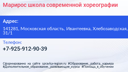 Марирос, школа современной хореографии по адресу 141281, Московская область, Ивантеевка, Хлебозаводская, 31/1 в дальнейшем Организация, размещена в следующих категориях: