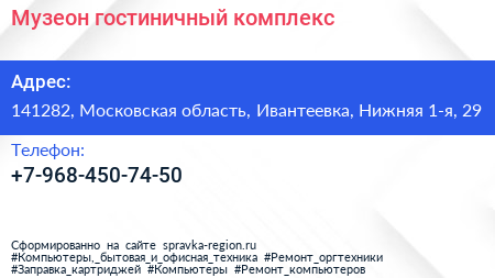 Музеон, гостиничный комплекс по адресу 141282, Московская область, Ивантеевка, Нижняя 1-я, 29 в дальнейшем Организация, размещена в следующих категориях: