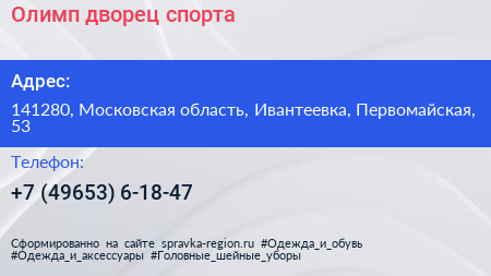 Олимп, дворец спорта по адресу 141280, Московская область, Ивантеевка, Первомайская, 53 в дальнейшем Организация, размещена в следующих категориях: