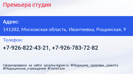 Премьера, студия по адресу 141282, Московская область, Ивантеевка, Рощинская, 9 в дальнейшем Организация, размещена в следующих категориях: