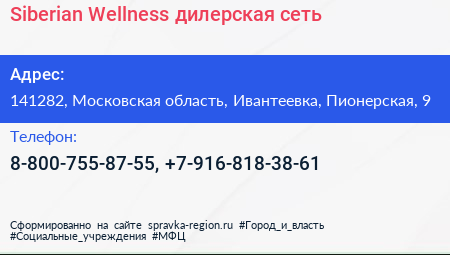 Siberian Wellness, дилерская сеть по адресу 141282, Московская область, Ивантеевка, Пионерская, 9 в дальнейшем Организация, размещена в следующих категориях: