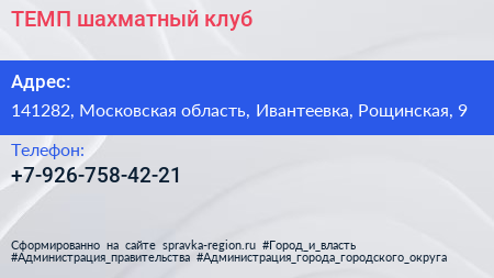 ТЕМП, шахматный клуб по адресу 141282, Московская область, Ивантеевка, Рощинская, 9 в дальнейшем Организация, размещена в следующих категориях: