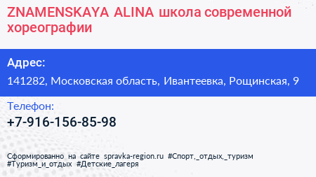 ZNAMENSKAYA ALINA, школа современной хореографии по адресу 141282, Московская область, Ивантеевка, Рощинская, 9 в дальнейшем Организация, размещена в следующих категориях: