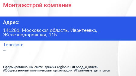 Монтажстрой, компания по адресу 141281, Московская область, Ивантеевка, Железнодорожная, 11Б в дальнейшем Организация, размещена в следующих категориях: