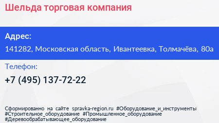 Шельда, торговая компания по адресу 141282, Московская область, Ивантеевка, Толмачёва, 80а в дальнейшем Организация, размещена в следующих категориях: