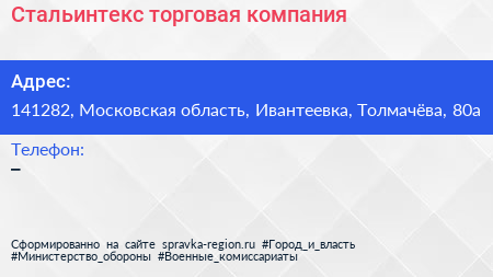 Стальинтекс, торговая компания по адресу 141282, Московская область, Ивантеевка, Толмачёва, 80а в дальнейшем Организация, размещена в следующих категориях: