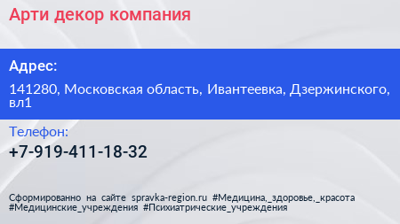 Арти-декор, компания по адресу 141280, Московская область, Ивантеевка, Дзержинского, вл1 в дальнейшем Организация, размещена в следующих категориях:
