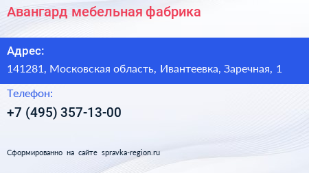 Авангард, мебельная фабрика по адресу 141281, Московская область, Ивантеевка, Заречная, 1 в дальнейшем Организация, размещена в следующих категориях: