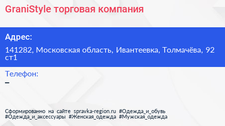 GraniStyle, торговая компания по адресу 141282, Московская область, Ивантеевка, Толмачёва, 92 ст1 в дальнейшем Организация, размещена в следующих категориях: