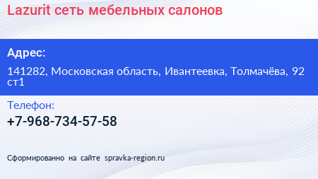 Lazurit, сеть мебельных салонов по адресу 141282, Московская область, Ивантеевка, Толмачёва, 92 ст1 в дальнейшем Организация, размещена в следующих категориях: