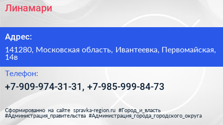 Линамари по адресу 141280, Московская область, Ивантеевка, Первомайская, 14в в дальнейшем Организация, размещена в следующих категориях: