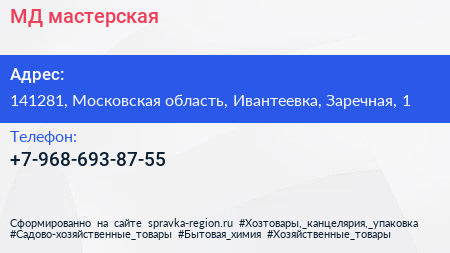 МД, мастерская по адресу 141281, Московская область, Ивантеевка, Заречная, 1 в дальнейшем Организация, размещена в следующих категориях: