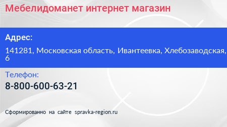 Мебелидоманет, интернет-магазин по адресу 141281, Московская область, Ивантеевка, Хлебозаводская, 6 в дальнейшем Организация, размещена в следующих категориях: