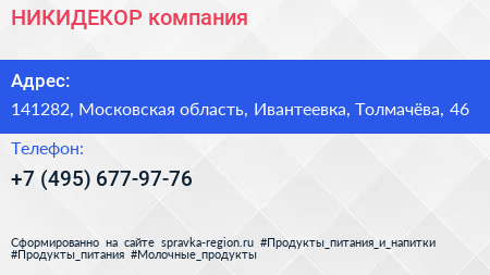 НИКИДЕКОР, компания по адресу 141282, Московская область, Ивантеевка, Толмачёва, 46 в дальнейшем Организация, размещена в следующих категориях: