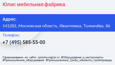 Юлис, мебельная фабрика по адресу 141282, Московская область, Ивантеевка, Толмачёва, 86 в дальнейшем Организация, размещена в следующих категориях: