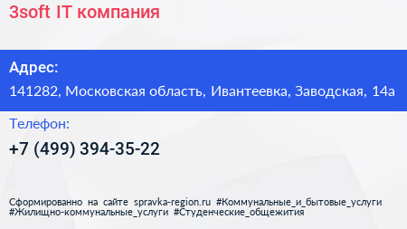 3soft, IT-компания по адресу 141282, Московская область, Ивантеевка, Заводская, 14а в дальнейшем Организация, размещена в следующих категориях: