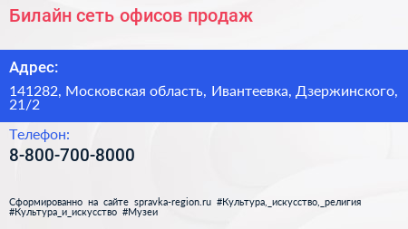 Билайн, сеть офисов продаж по адресу 141282, Московская область, Ивантеевка, Дзержинского, 21/2 в дальнейшем Организация, размещена в следующих категориях: