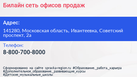 Билайн, сеть офисов продаж по адресу 141280, Московская область, Ивантеевка, Советский проспект, 2а в дальнейшем Организация, размещена в следующих категориях: