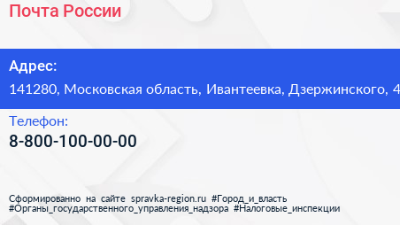 Почта России по адресу 141280, Московская область, Ивантеевка, Дзержинского, 4 в дальнейшем Организация, размещена в следующих категориях: