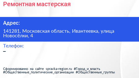 Ремонтная мастерская по адресу 141281, Московская область, Ивантеевка, улица Новосёлки, 4 в дальнейшем Организация, размещена в следующих категориях: