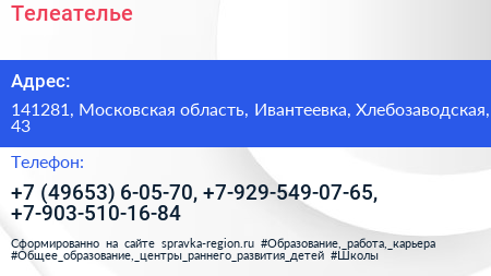 Телеателье по адресу 141281, Московская область, Ивантеевка, Хлебозаводская, 43 в дальнейшем Организация, размещена в следующих категориях: