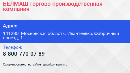 БЕЛМАШ, торгово-производственная компания по адресу 141280, Московская область, Ивантеевка, Фабричный проезд, 1 в дальнейшем Организация, размещена в следующих категориях: