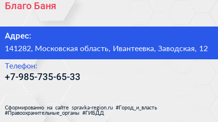 Благо Баня по адресу 141282, Московская область, Ивантеевка, Заводская, 12 в дальнейшем Организация, размещена в следующих категориях: