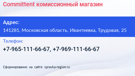 Committent, комиссионный магазин по адресу 141281, Московская область, Ивантеевка, Трудовая, 25 в дальнейшем Организация, размещена в следующих категориях: