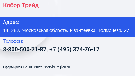 Кобор Трейд по адресу 141282, Московская область, Ивантеевка, Толмачёва, 27 в дальнейшем Организация, размещена в следующих категориях: