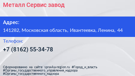 Металл Сервис, завод по адресу 141282, Московская область, Ивантеевка, Ленина, 44 в дальнейшем Организация, размещена в следующих категориях: