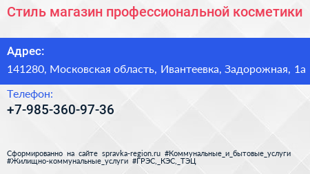 Стиль, магазин профессиональной косметики по адресу 141280, Московская область, Ивантеевка, Задорожная, 1а в дальнейшем Организация, размещена в следующих категориях: