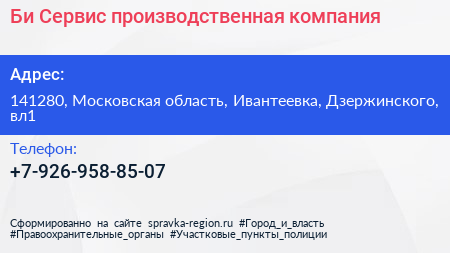 Би Сервис, производственная компания по адресу 141280, Московская область, Ивантеевка, Дзержинского, вл1 в дальнейшем Организация, размещена в следующих категориях:
