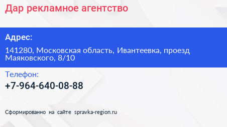 Дар, рекламное агентство по адресу 141280, Московская область, Ивантеевка, проезд Маяковского, 8/10 в дальнейшем Организация, размещена в следующих категориях: