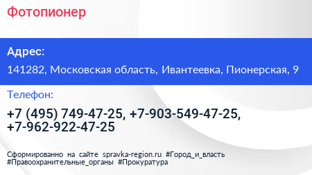 Фотопионер по адресу 141282, Московская область, Ивантеевка, Пионерская, 9 в дальнейшем Организация, размещена в следующих категориях: