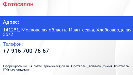 Фотосалон по адресу 141281, Московская область, Ивантеевка, Хлебозаводская, 35/2 в дальнейшем Организация, размещена в следующих категориях: