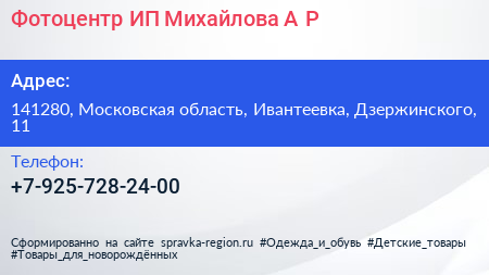 Фотоцентр, ИП Михайлова А.Р. по адресу 141280, Московская область, Ивантеевка, Дзержинского, 11 в дальнейшем Организация, размещена в следующих категориях: