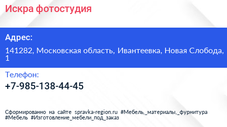 Искра, фотостудия по адресу 141282, Московская область, Ивантеевка, Новая Слобода, 1 в дальнейшем Организация, размещена в следующих категориях: