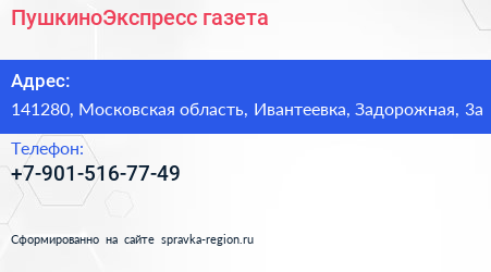 ПушкиноЭкспресс, газета по адресу 141280, Московская область, Ивантеевка, Задорожная, 3а в дальнейшем Организация, размещена в следующих категориях: