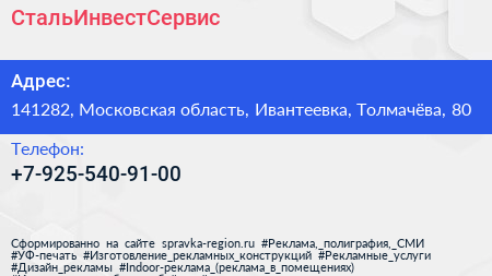 СтальИнвестСервис по адресу 141282, Московская область, Ивантеевка, Толмачёва, 80 в дальнейшем Организация, размещена в следующих категориях: