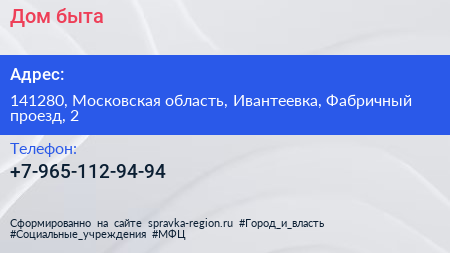 Дом быта по адресу 141280, Московская область, Ивантеевка, Фабричный проезд, 2 в дальнейшем Организация, размещена в следующих категориях: