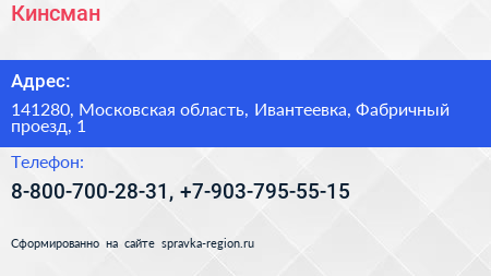 Кинсман по адресу 141280, Московская область, Ивантеевка, Фабричный проезд, 1 в дальнейшем Организация, размещена в следующих категориях:
