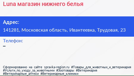 Luna, магазин нижнего белья по адресу 141281, Московская область, Ивантеевка, Трудовая, 23 в дальнейшем Организация, размещена в следующих категориях: