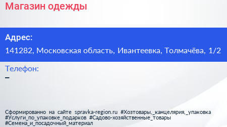 Магазин одежды по адресу 141282, Московская область, Ивантеевка, Толмачёва, 1/2 в дальнейшем Организация, размещена в следующих категориях:
