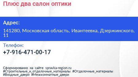 Плюс два, салон оптики по адресу 141280, Московская область, Ивантеевка, Дзержинского, 11 в дальнейшем Организация, размещена в следующих категориях: