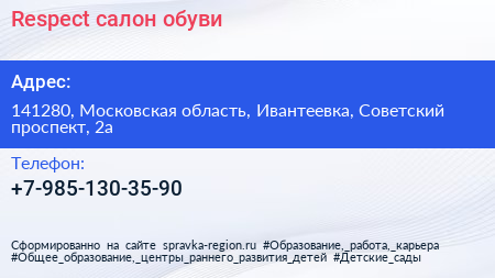 Respect, салон обуви по адресу 141280, Московская область, Ивантеевка, Советский проспект, 2а в дальнейшем Организация, размещена в следующих категориях: