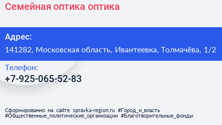 Семейная оптика, оптика по адресу 141282, Московская область, Ивантеевка, Толмачёва, 1/2 в дальнейшем Организация, размещена в следующих категориях: