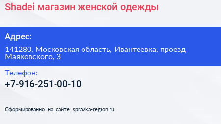 Shadei, магазин женской одежды по адресу 141280, Московская область, Ивантеевка, проезд Маяковского, 3 в дальнейшем Организация, размещена в следующих категориях: