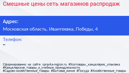 Смешные цены, сеть магазинов распродаж по адресу Московская область, Ивантеевка, Победы, 4 в дальнейшем Организация, размещена в следующих категориях: