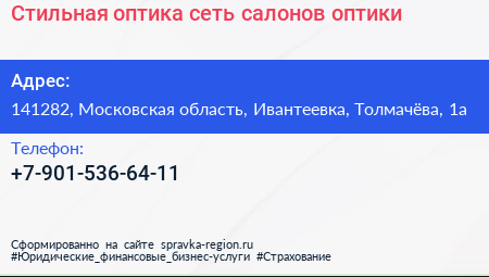 Стильная оптика, сеть салонов оптики по адресу 141282, Московская область, Ивантеевка, Толмачёва, 1а в дальнейшем Организация, размещена в следующих категориях:
