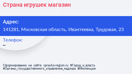Страна игрушек, магазин по адресу 141281, Московская область, Ивантеевка, Трудовая, 23 в дальнейшем Организация, размещена в следующих категориях: